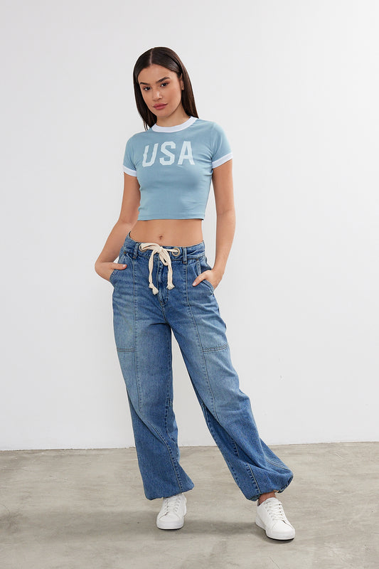 Womens USA Printed Crop Top Cropped USA T-Shirt (S-M-L / 2-2-2) 6 Pieces