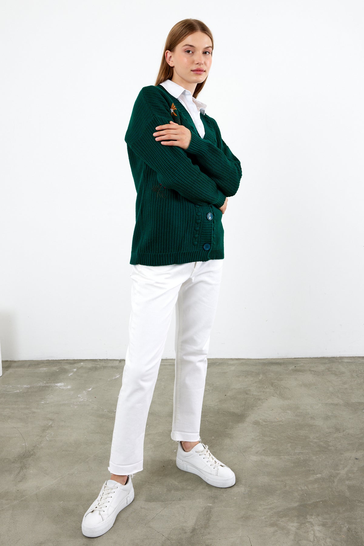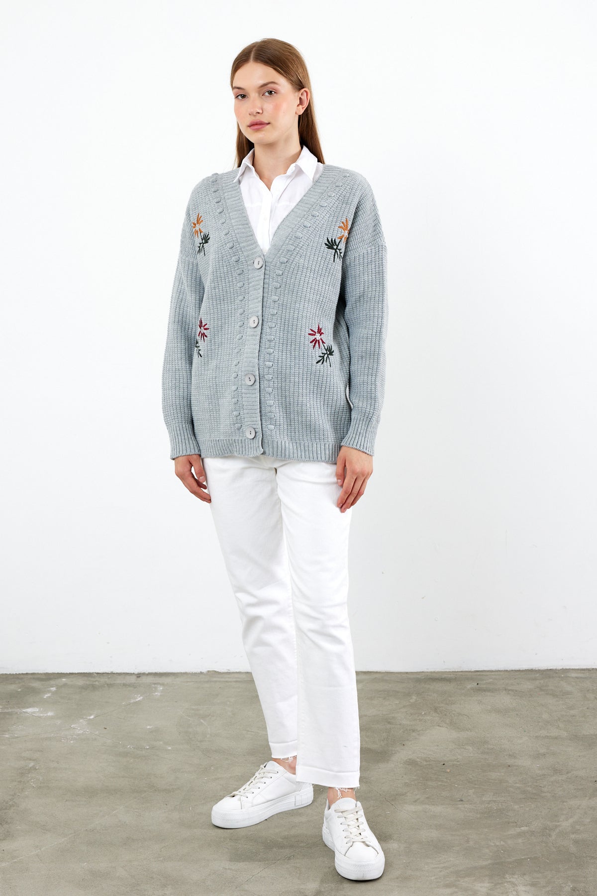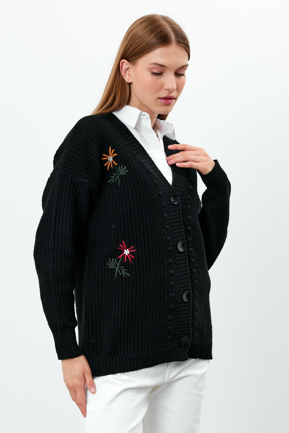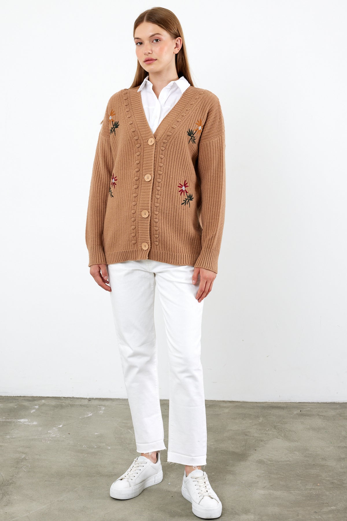 Great flower embroidered mid length knit cardigan, wholesale women's cardigan , a must have classic for your business.