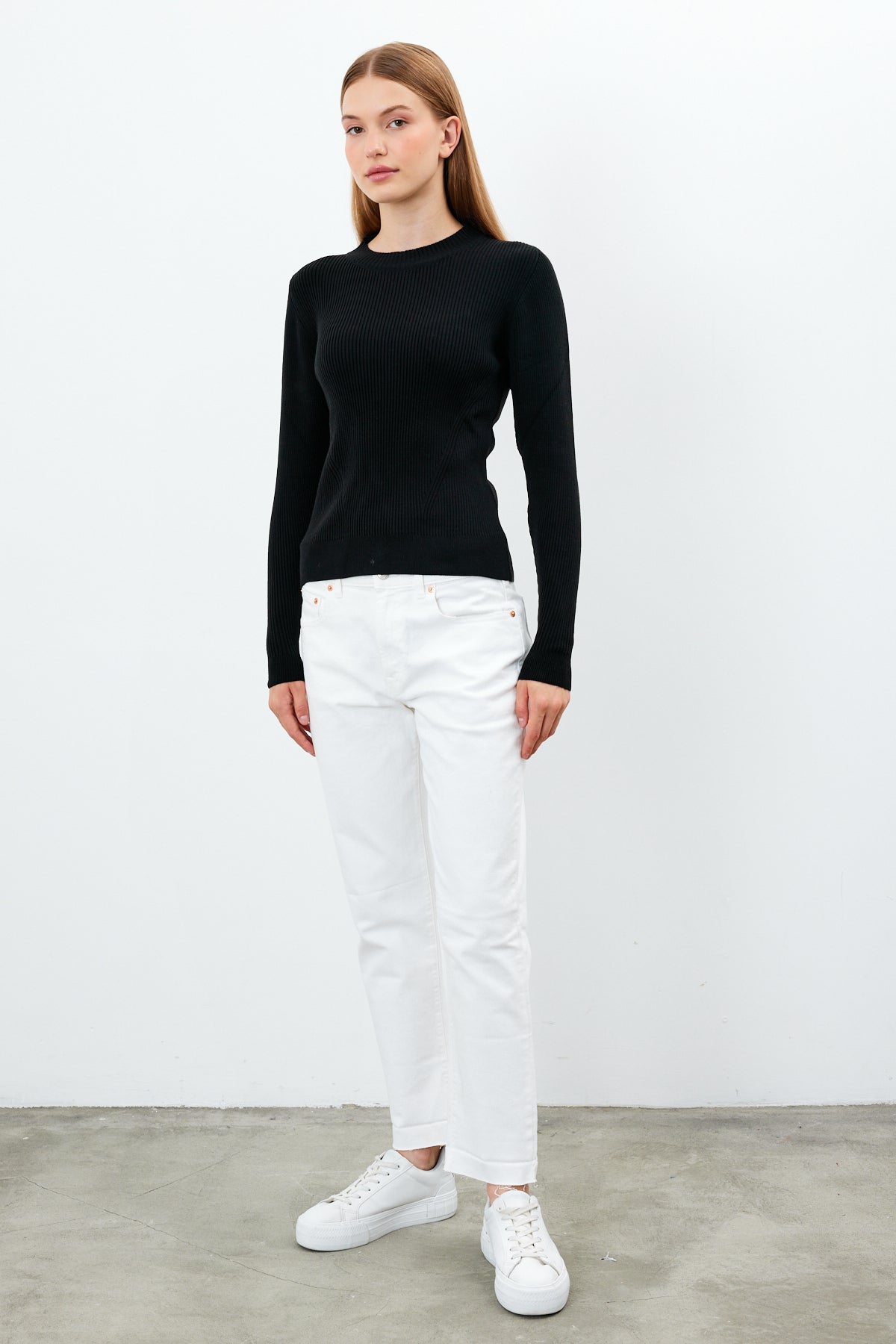 Great crewneck solid color knit top, a must have classic for your business.