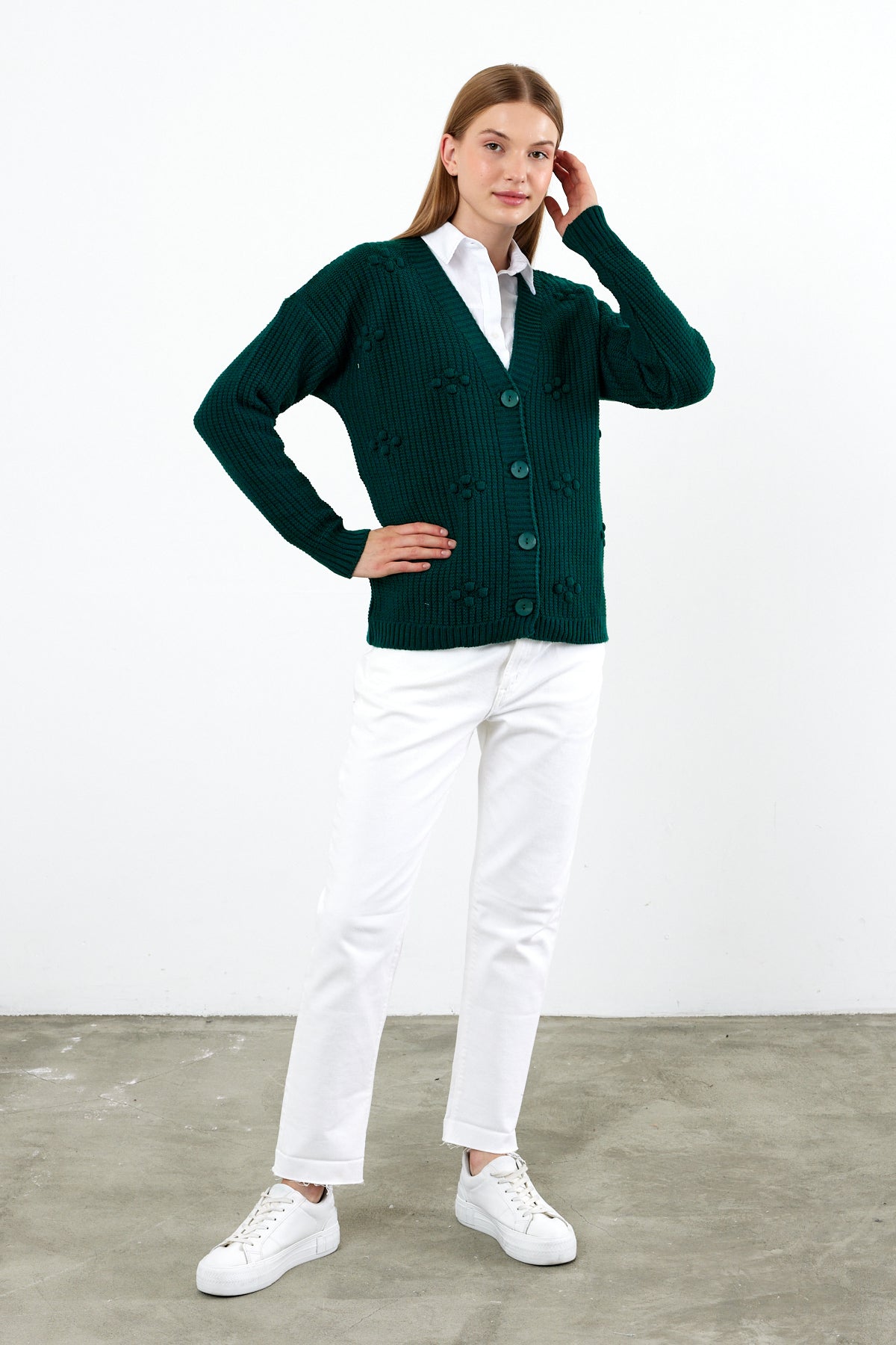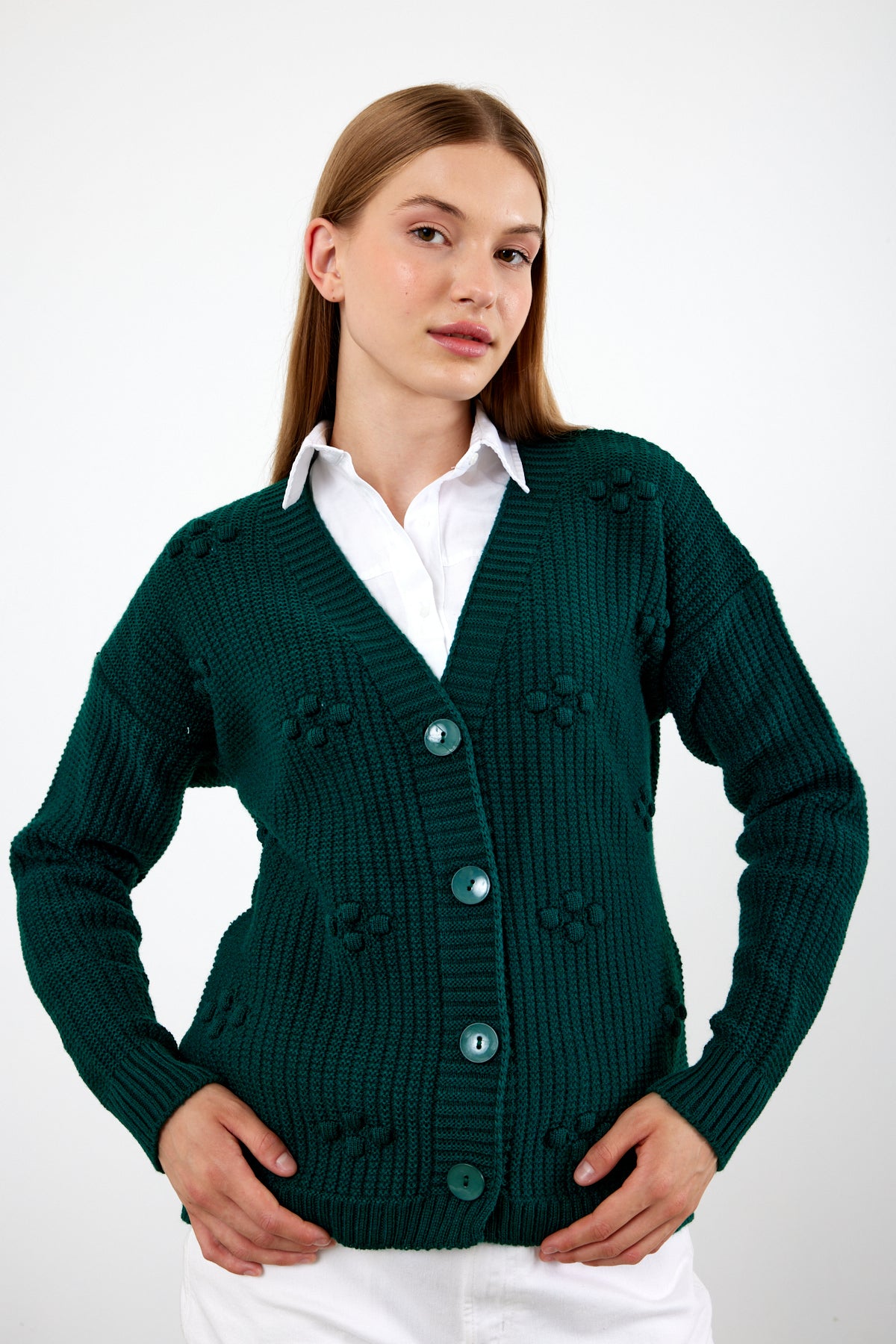 Great solid color knit cardigan , a must have classic for your business.